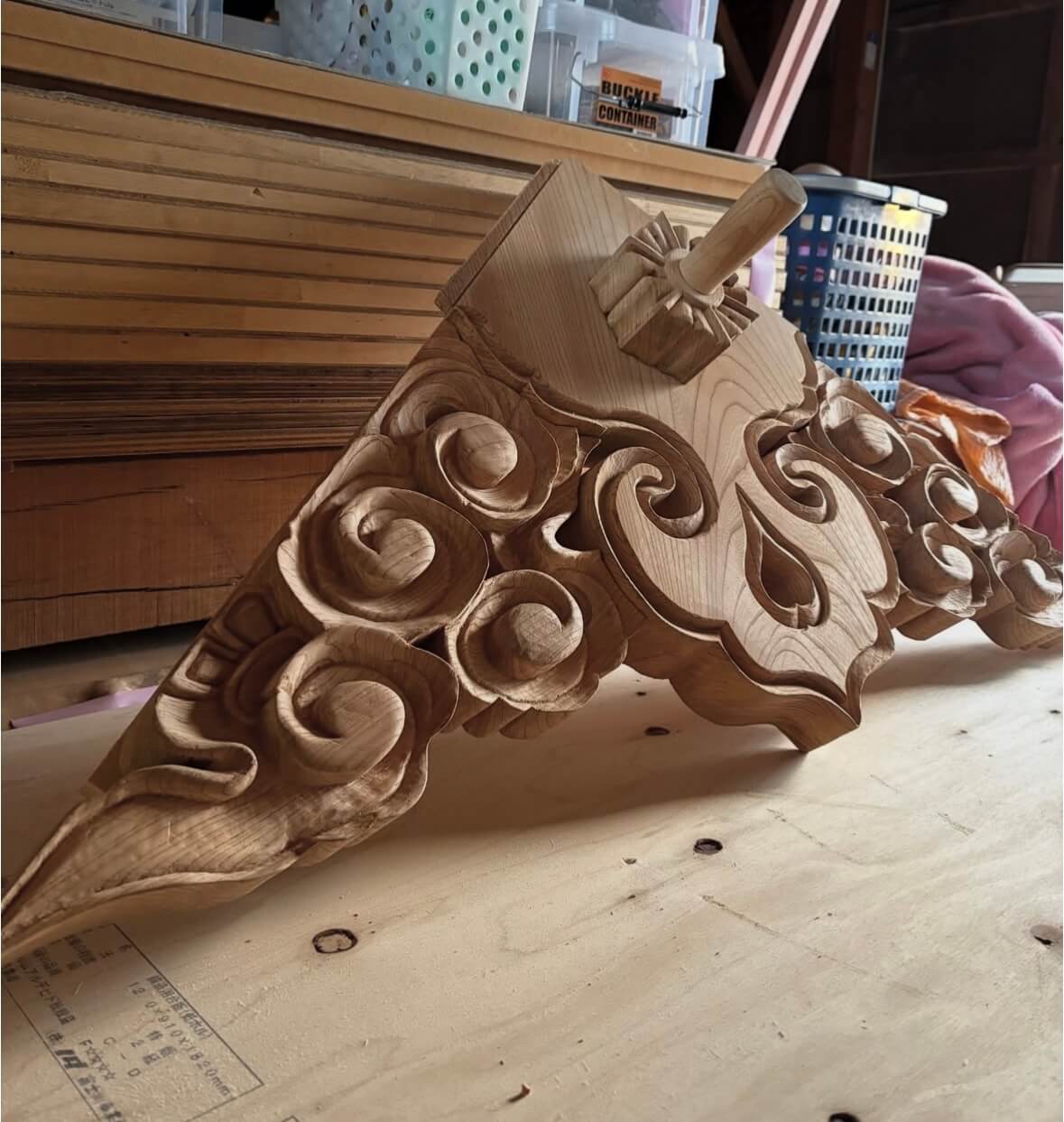 細やかな曲線と立体感のある彫りが美しい木彫りの装飾。