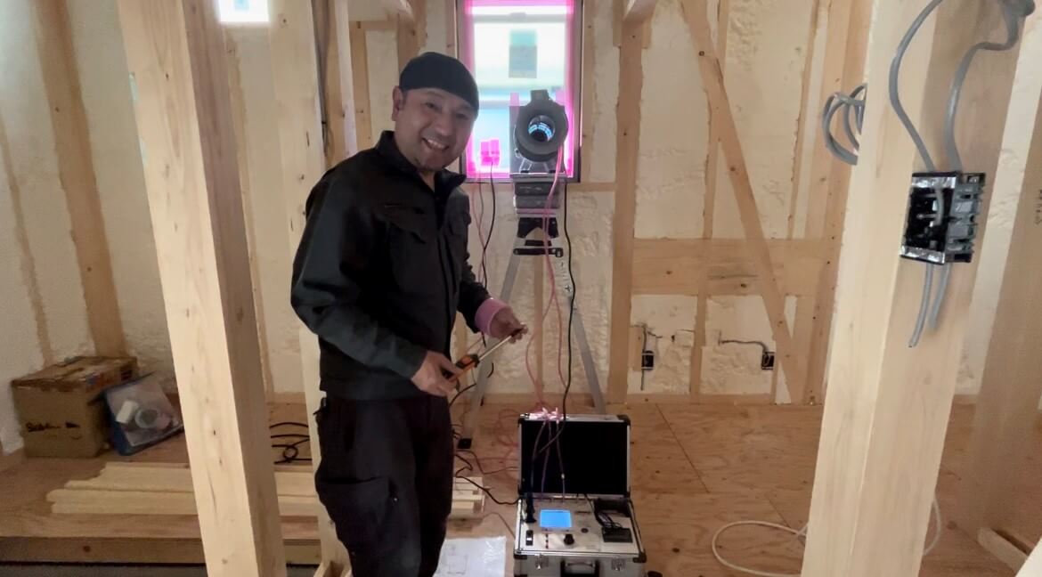 断熱材も吹き終わり、この日は住宅の気密検査をしに業者さんに来てもらいました♪