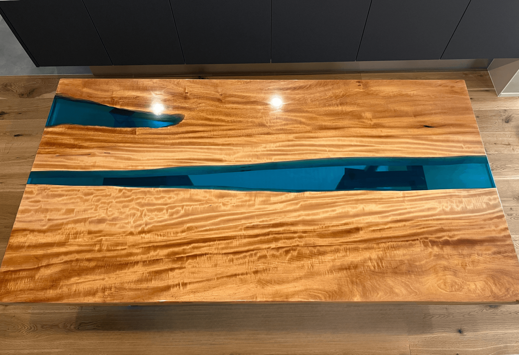 無垢材の自然な木目と、クリアなブルーのレジン(樹脂)を組み合わせた“リバーテーブル”は、まさにアートのような存在感。