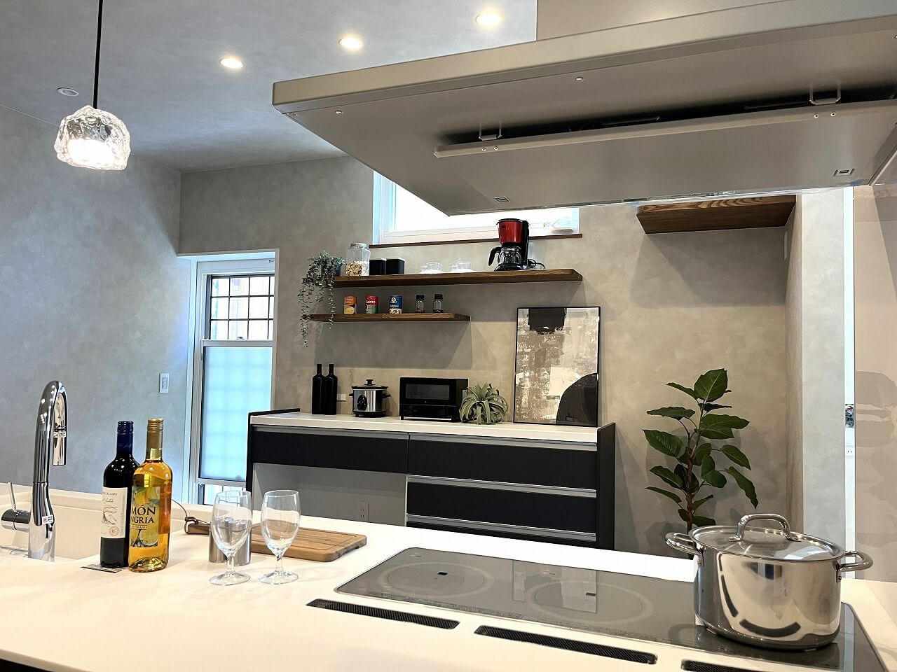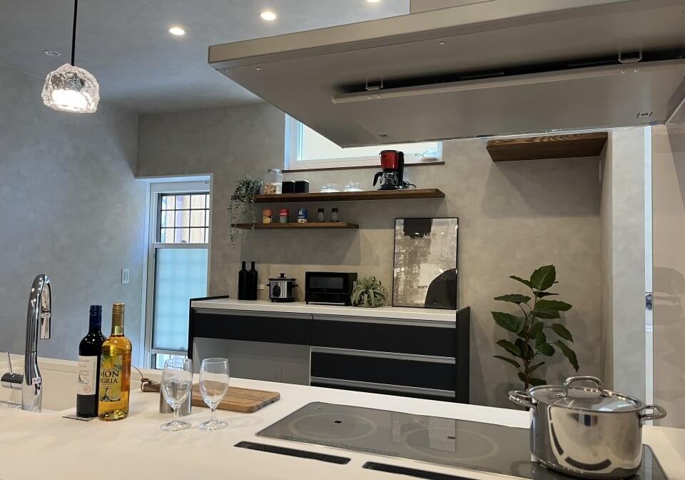 リビングとキッチンをゆるやかに分けるアクセントウォール。落ち着いた素材感と間接照明の柔らかな光が、空間にやさしい奥行きを生み出します。