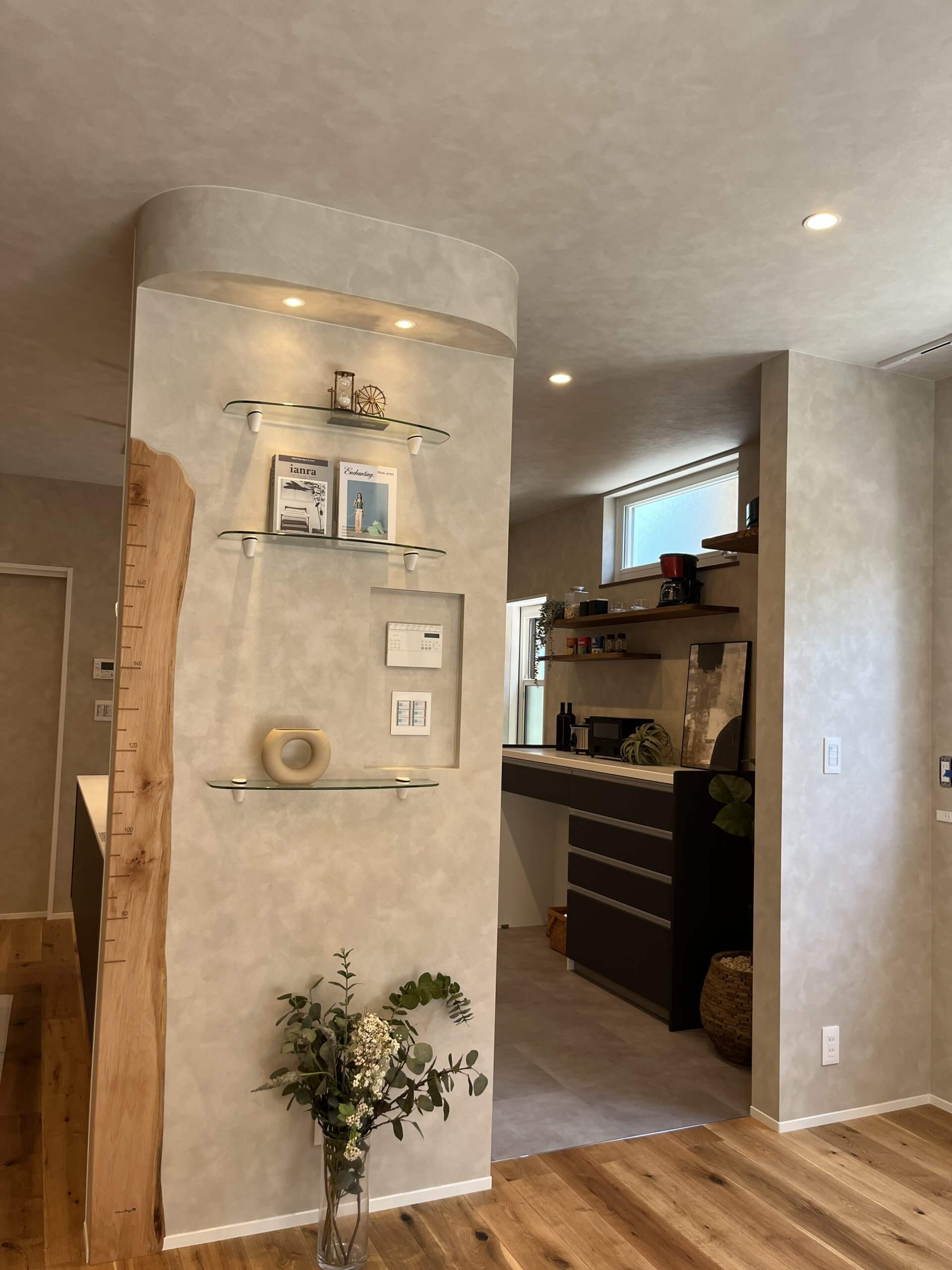 壁面にはガラスの飾り棚を設け、季節の雑貨やお気に入りの本をディスプレイ。暮らしに合わせて自由に表情を変えられるのも魅力です。