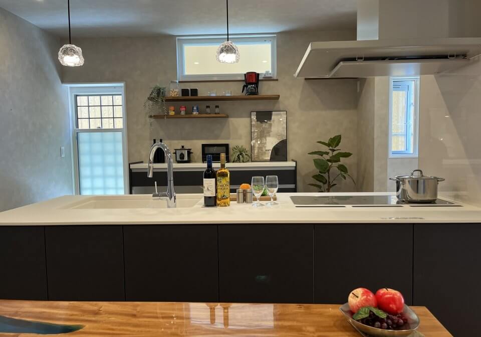 美しい天板は見た目の上質さだけでなく、作業性にも優れ、家族との会話を楽しみながら家事ができる工夫がされています。