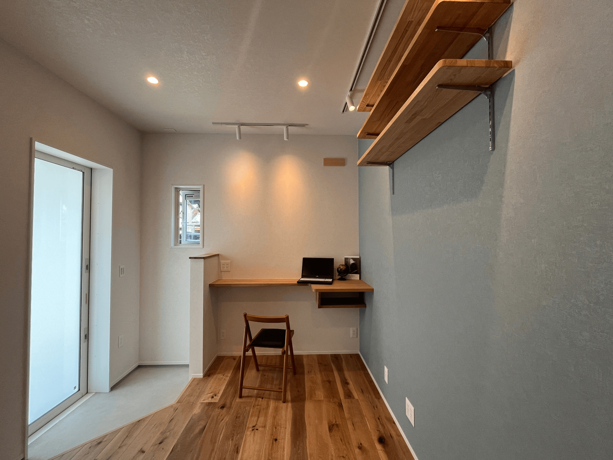 造作デスクと飾り棚を備え、集中しやすい環境を整えつつ、床材や壁の色合い、照明のトーンにもこだわって、居心地のよさも追求しました。