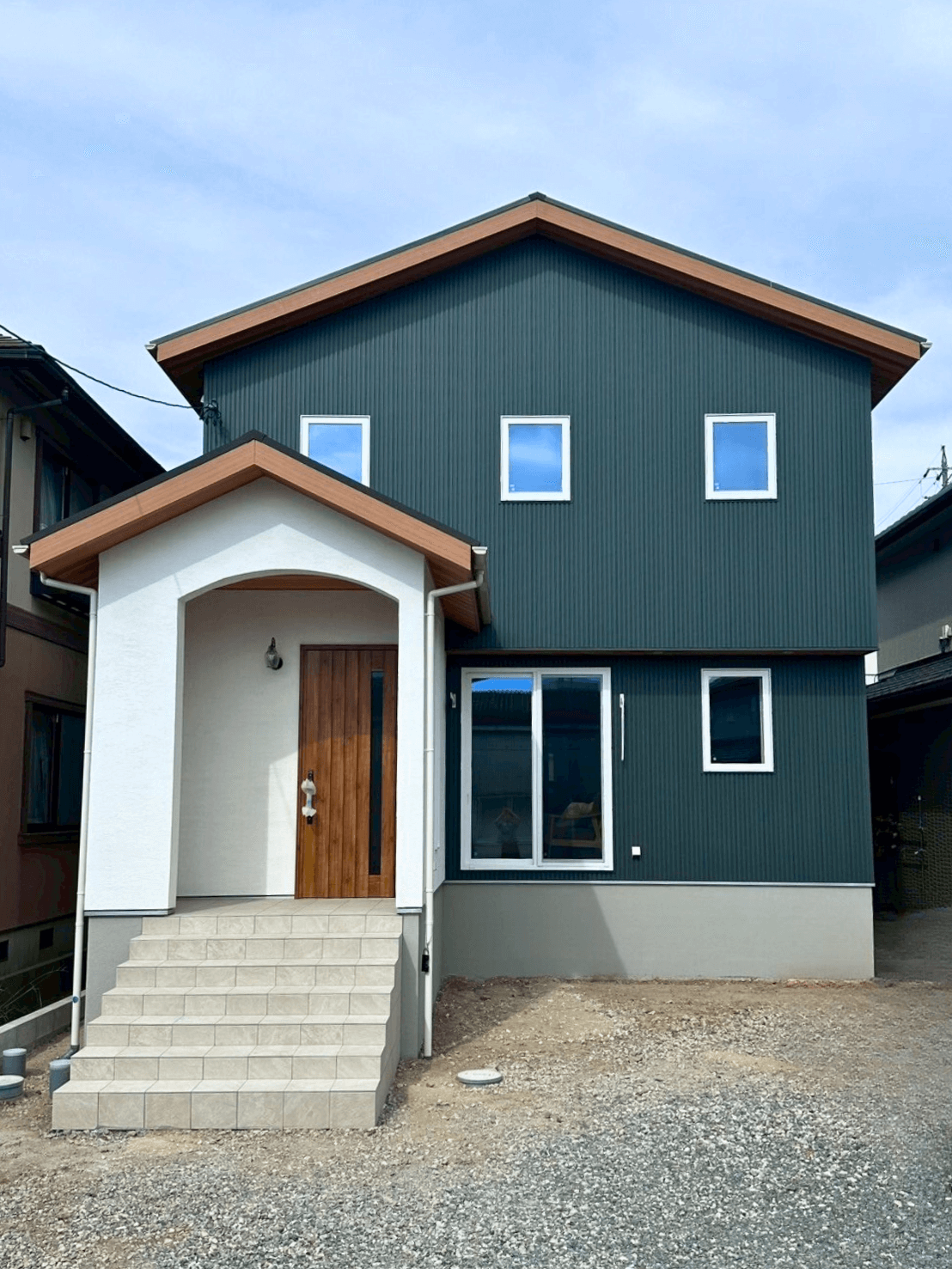 2つの三角屋根と、緑のガルバリウムが印象的な可愛らしい外観のお宅