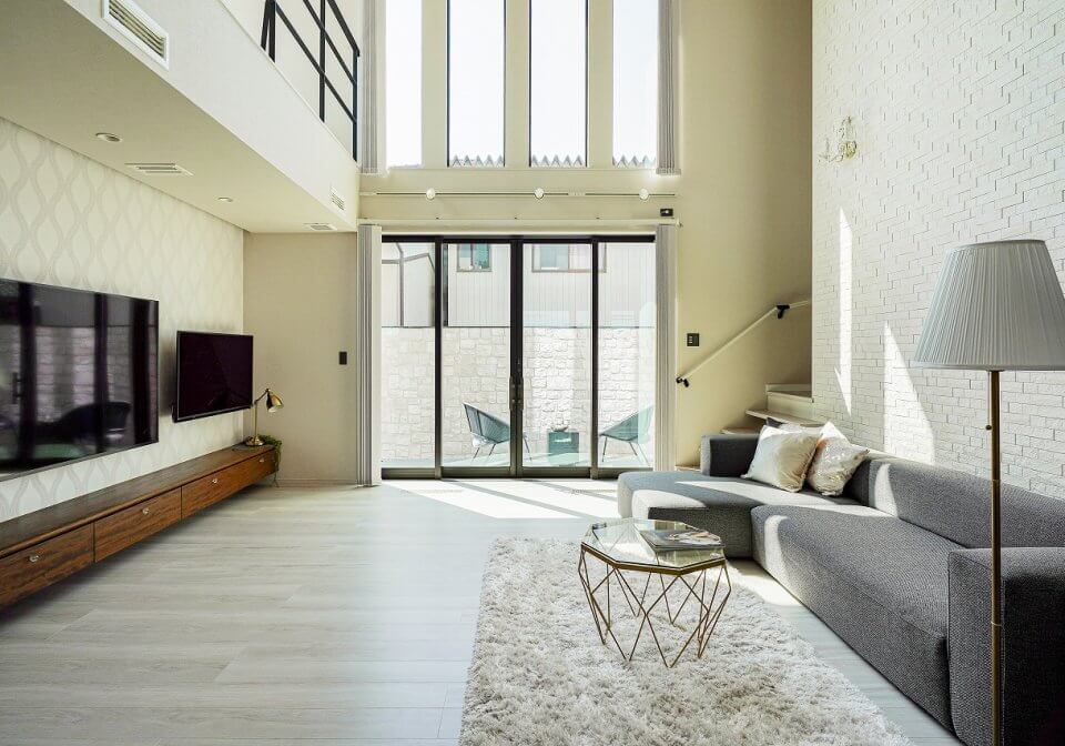 リビングの高い吹き抜け、フルオープンのワイドサイズの掃き出し